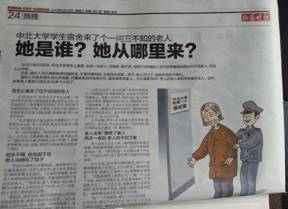 2013年9月26日晚9时许,中北大学安全保卫部(处)校园110值班室接到本校六号学生公寓楼管电话:有一名神志不清的老太太在其楼道内走动,怀疑为走失人员。我处值班人员陈阳等人立即将老人接到值班室,并细心照顾。经过值班人员一个多小时的耐心询问,在老人含糊不清的言语中,得知是剪子湾村人这一仅有线索,通过警务站迅速联系当地派出所和村治保主任,找到其家人。凌晨2点左右,家属焦急万分地赶到我处,确认是其家人,并称老人已经走失了两天。家属万分感激我处对其母亲无微不至的照顾、救助。