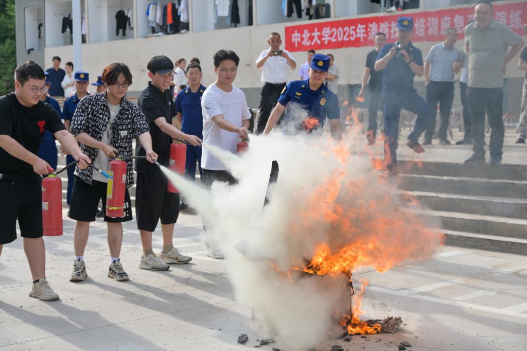 演练结束后,相关部门组织全体参演学生在指定区域开展灭火器、消防栓实践实操考核。