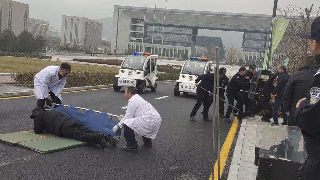 根据学校年度安全工作计划安排,为应对近期省外校园暴恐事件有所抬头的形势,11月19日上午,安全保卫部联合上兰派出所、猛虎保安服务公司、校医院组织了一场以歹徒持刀冲击门卫为背景的反恐应急演练。通过演练全面检验了校园安保人员处理暴恐事件的职责分工和处置流程,有效锻炼了安保人员多方联动、快速反应、迅即处置的应急反应能力。